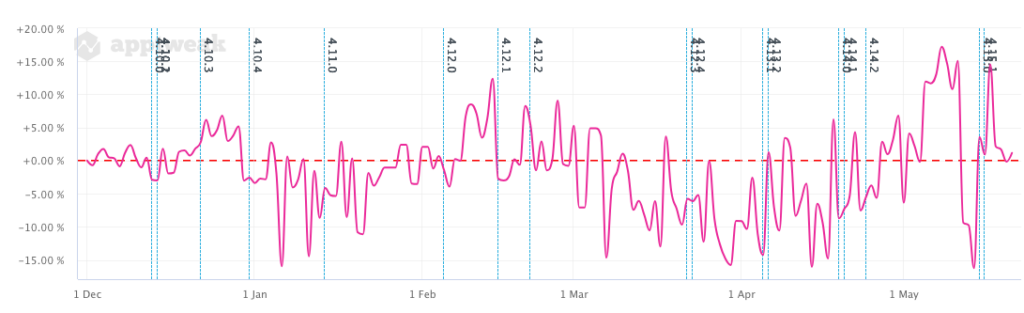 We also saw that keyword rankings were moving up and down all the time. You can see how dramatic these rises and falls are below in the Google Play Store through this “visibility score” diagram generated by AppTweak: