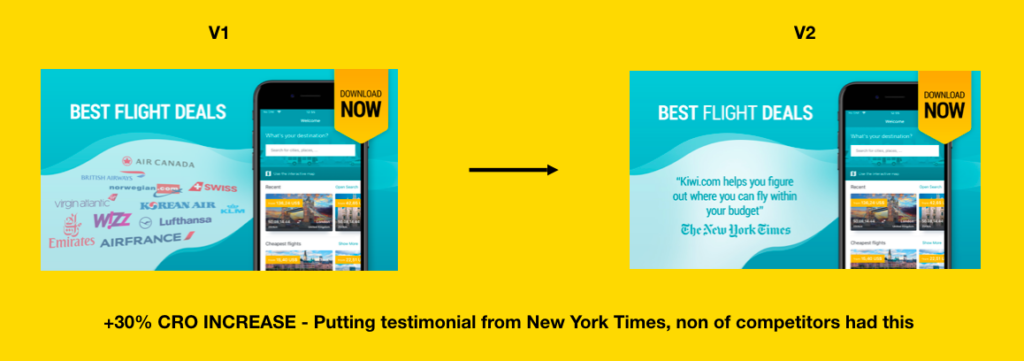 Another experiment we came up with was the idea of using some of the great testimonials the app had received from trustworthy outlets. Kiwi.com has had positive reviews from across the world, including publications like the New York Times. Once we checked screenshots of our competitors and saw that no one else was leveraging such social proof, we decided to give it a try.